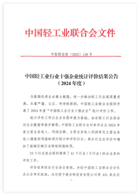 2025年7月9日,中國輕工業(yè)聯(lián)合會發(fā)布《中國輕工業(yè)行業(yè)十強企業(yè)統(tǒng)計評價結果公告》(中輕聯(lián)信統(tǒng)(2025)136號),發(fā)布了我國輕工業(yè)各行業(yè)的“2024年度中國輕工業(yè)行業(yè)十強企業(yè)”名單。